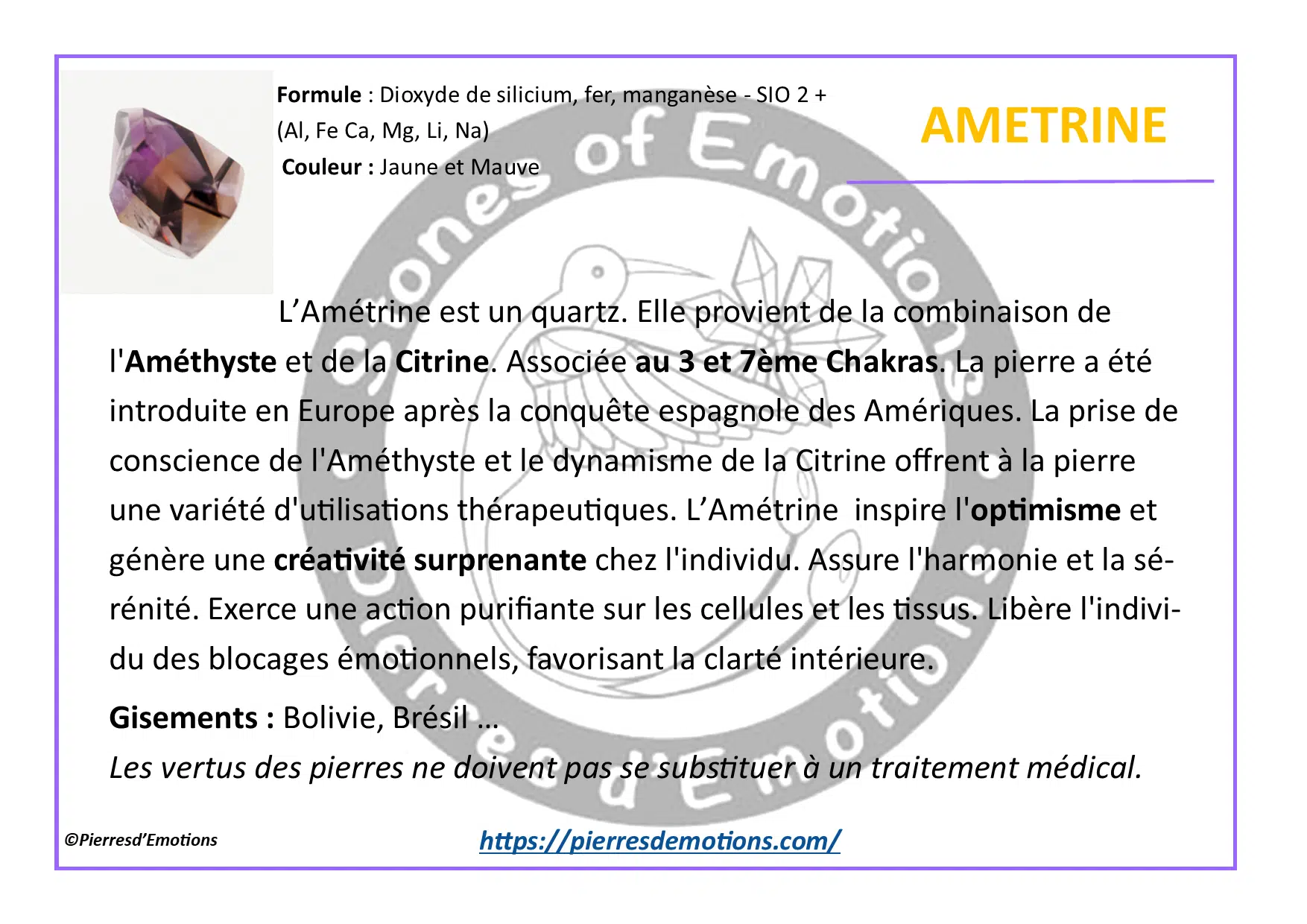 L’Amétrine est un quartz. Elle provient de la combinaison de l’Améthyste et de la Citrine. Associée au 3 et 7ème Chakras. La pierre a été introduite en Europe après la conquête espagnole des Amériques. La prise de conscience de l’Améthyste et le dynamisme de la Citrine offrent à la pierre une variété d’utilisations thérapeutiques. L’Amétrine inspire l’optimisme et génère une créativité surprenante chez l’individu. Assure l’harmonie et la sérénité. Exerce une action purifiante sur les cellules et les tissus. Libère l’individu des blocages émotionnels, favorisant la clarté intérieure.