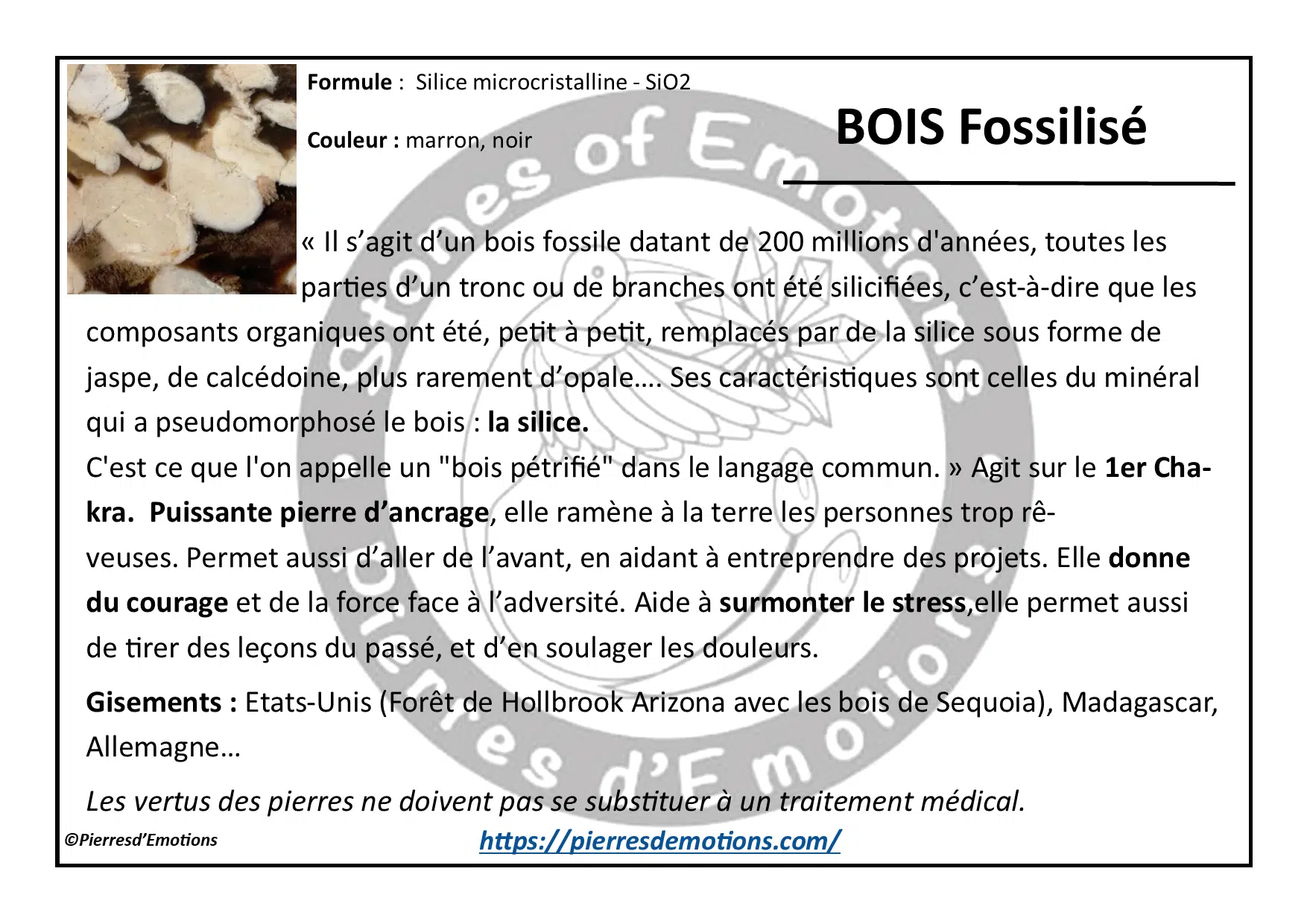 « Il s’agit d’un bois fossile datant de 200 millions d’années, toutes les parties d’un tronc ou de branches ont été silicifiées, c’est-à-dire que les composants organiques ont été, petit à petit, remplacés par de la silice sous forme de jaspe, de calcédoine, plus rarement d’opale…. Ses caractéristiques sont celles du minéral qui a pseudomorphosé le bois : la silice.