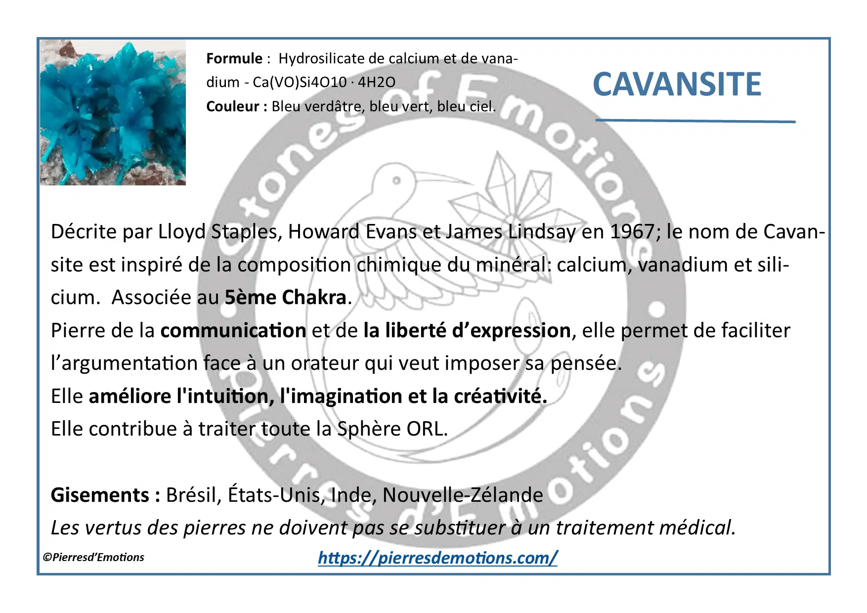 • Formule : Hydrosilicate de calcium et de vanadium – Ca(VO)Si4O10 · 4H2O