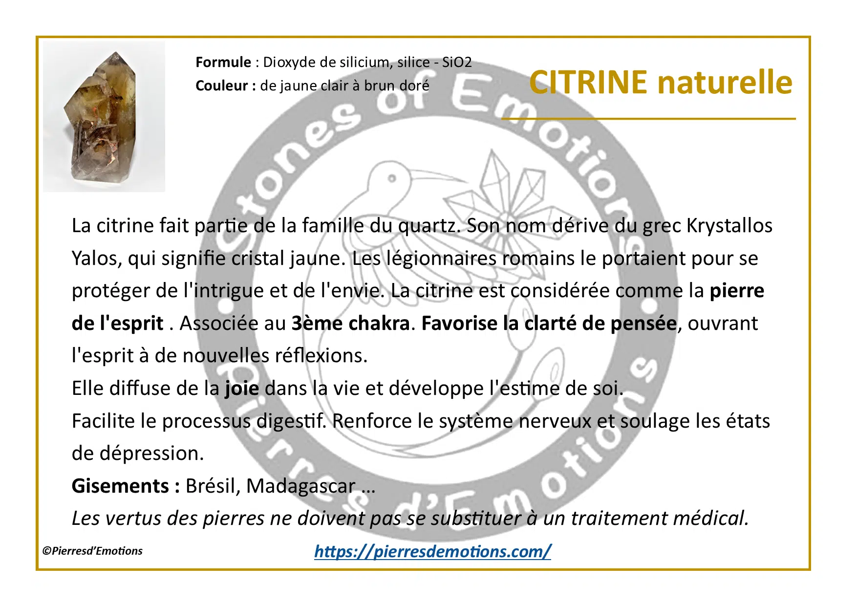 La citrine fait partie de la famille du quartz. Son nom dérive du grec Krystallos Yalos, qui signifie cristal jaune. Les légionnaires romains le portaient pour se protéger de l’intrigue et de l’envie. La citrine est considérée comme la pierre de l’esprit . Associée au 3ème chakra. Favorise la clarté de pensée, ouvrant l’esprit à de nouvelles réflexions.