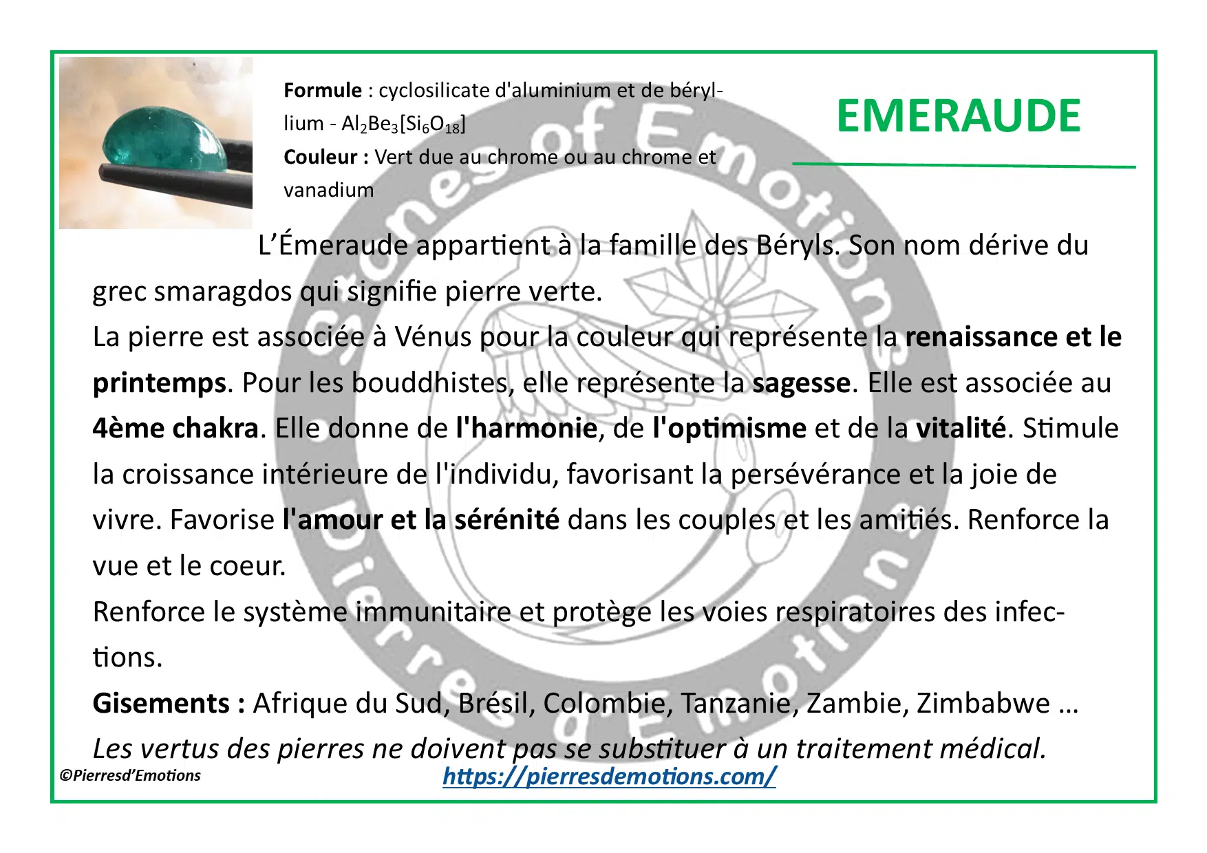 L’Émeraude appartient à la famille des Béryls. Son nom dérive du grec smaragdos qui signifie pierre verte.
