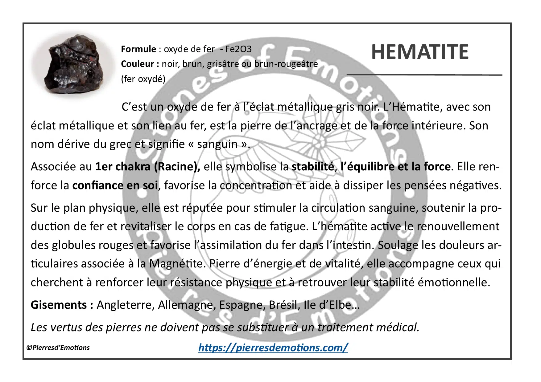 C’est un oxyde de fer à l’éclat métallique gris noir. L’Hématite, avec son éclat métallique et son lien au fer, est la pierre de l’ancrage et de la force intérieure. Son nom dérive du grec et signifie « sanguin ».