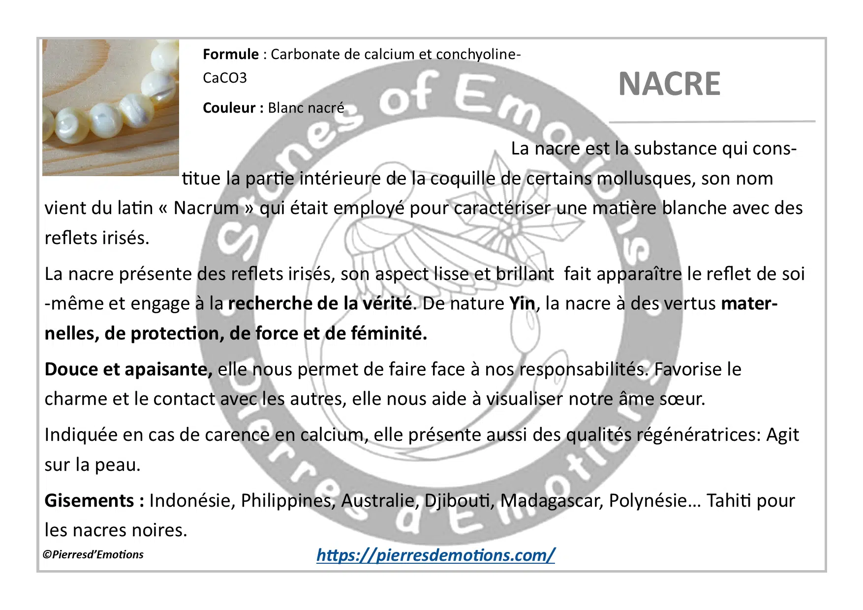 La nacre présente des reflets irisés, son aspect lisse et brillant fait apparaître le reflet de soi-même et engage à la recherche de la vérité. De nature Yin, la nacre à des vertus maternelles, de protection, de force et de féminité.