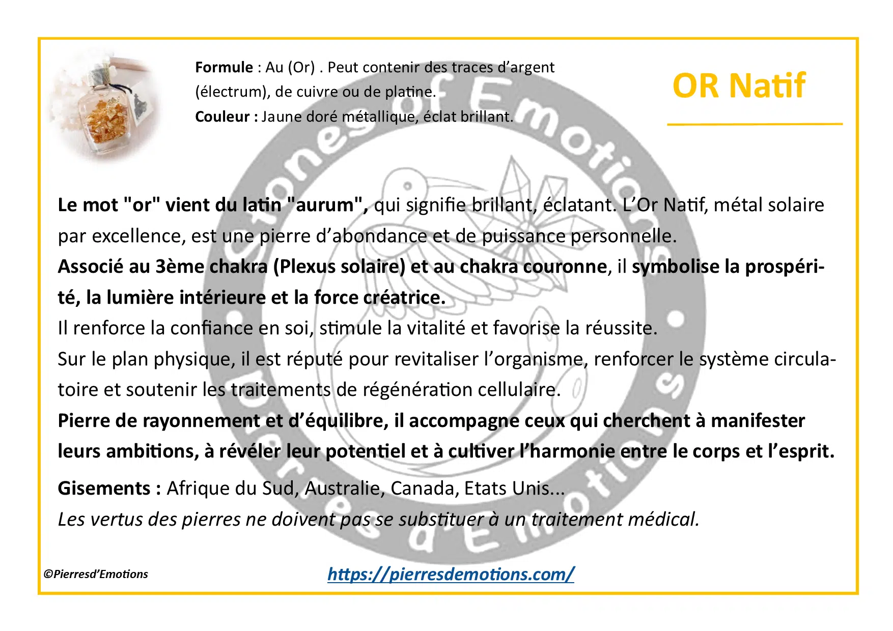 Le mot « or » vient du latin « aurum », qui signifie brillant, éclatant. L’Or Natif, métal solaire par excellence, est une pierre d’abondance et de puissance personnelle.