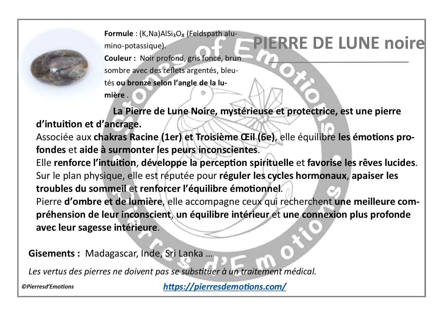 La Pierre de Lune Noire, mystérieuse et protectrice, est une pierre d’intuition et d’ancrage.
