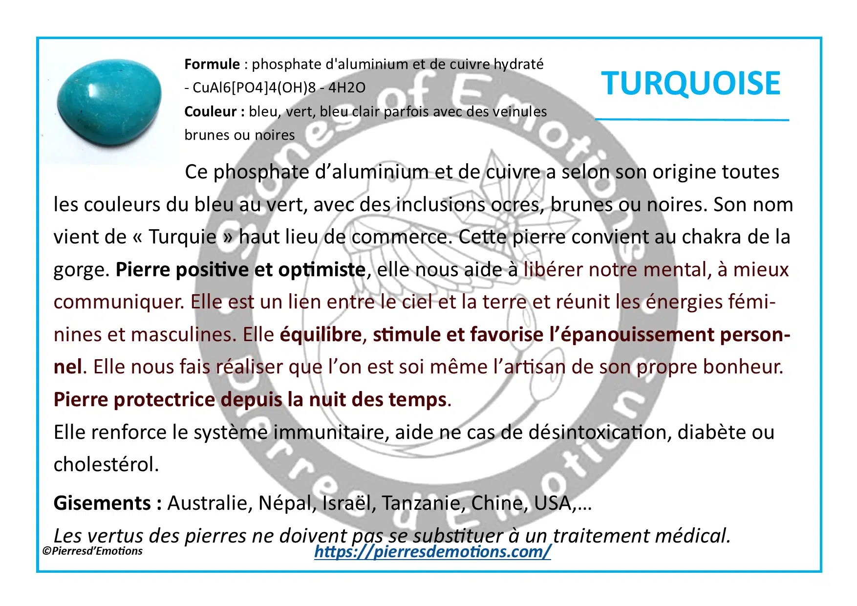 Ce phosphate d’aluminium et de cuivre a selon son origine toutes les couleurs du bleu au vert, avec des inclusions ocres, brunes ou noires. Son nom vient de « Turquie » haut lieu de commerce. Cette pierre convient au chakra de la gorge. Pierre positive et optimiste, elle nous aide à libérer notre mental, à mieux communiquer. Elle est un lien entre le ciel et la terre et réunit les énergies féminines et masculines. Elle équilibre, stimule et favorise l’épanouissement personnel. Elle nous fais réaliser que l’on est soi-même l’artisan de son propre bonheur. Pierre protectrice depuis la nuit des temps.