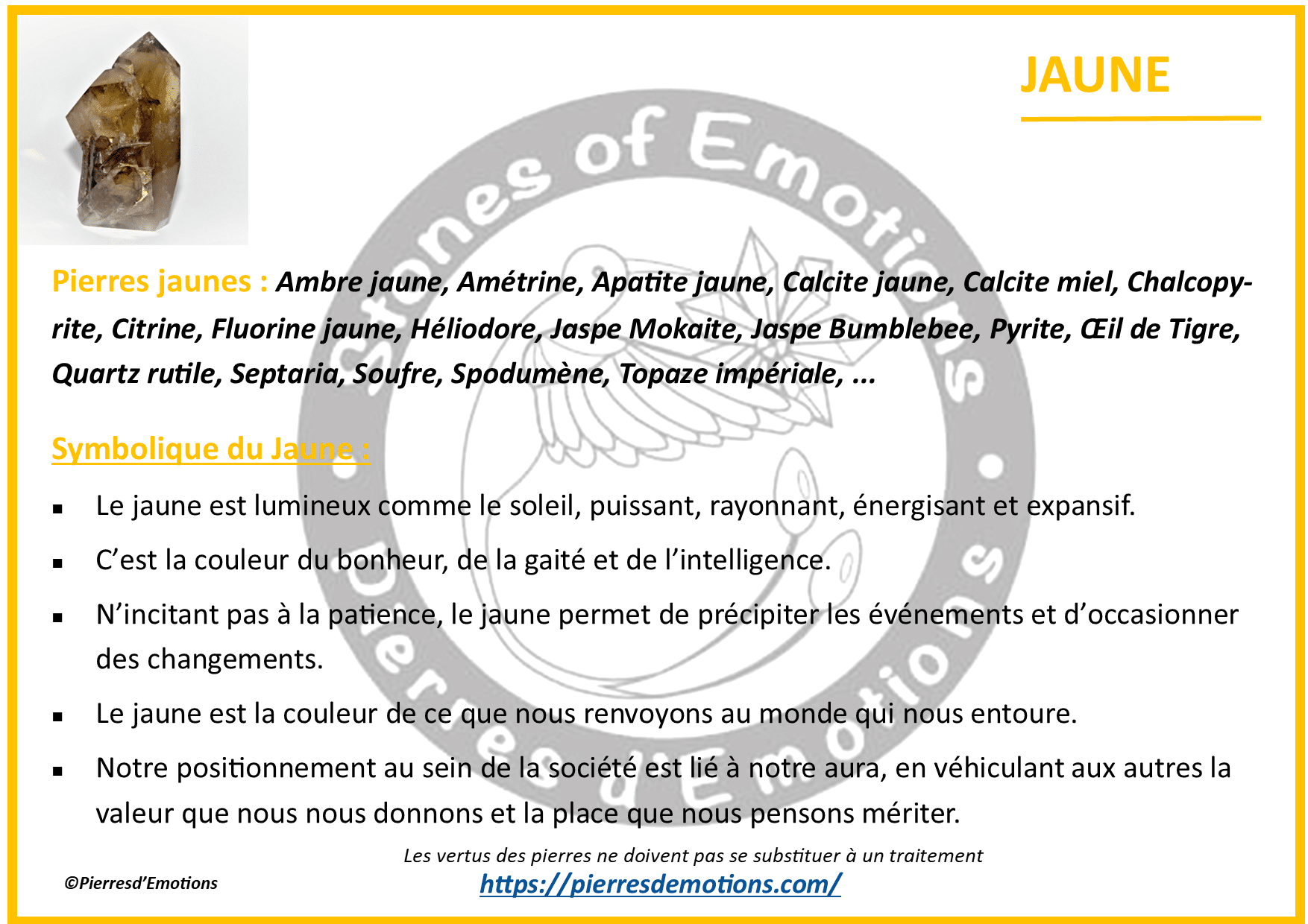En lithothérapie, les pierres jaunes sont reliées au chakra du Plexus Solaire, centre de la volonté, du rayonnement personnel, de la confiance et de la réussite.